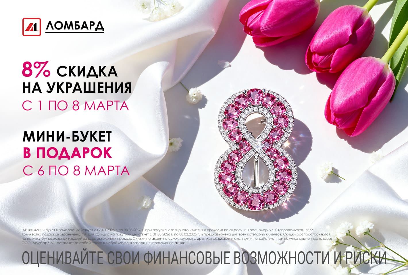 *Акция «Мини-букет в подарок» действует с 06.03.2026 г. по 08.03.2026 г. при покупке ювелирного изделия и проходит по адресу: г. Краснодар, ул. Ставропольская, 63/2. Количество подарков ограничено.