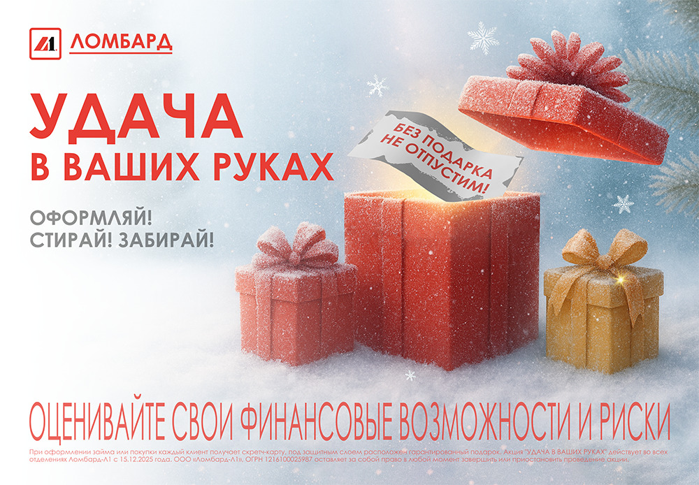 *При оформлении займа или покупки каждый клиент получает скретч-карту, под защитным слоем расположен гарантированный подарок. Акция "УДАЧА В ВАШИХ РУКАХ" действует во всех отделениях Ломбард-Л1 с 15.12.2025 года. ООО «Ломбард-Л1», ОГРН 1216100025987 оставляет за собой право в любой момент завершить или приостановить проведение акции.
